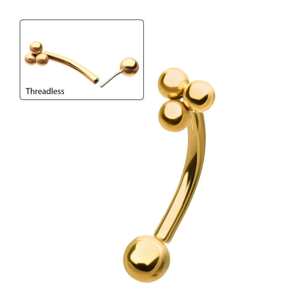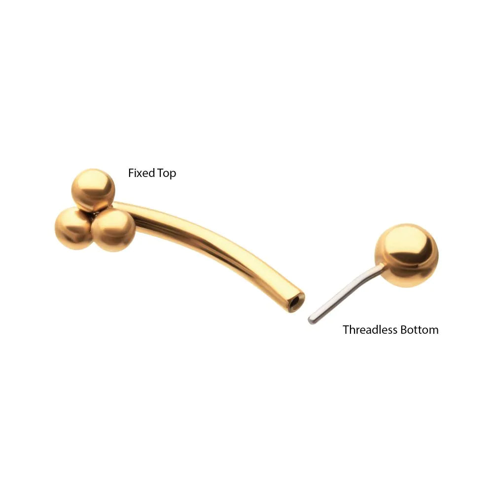 24kt Gold PVD Titanium Tri-Bead Fixed Top with Threadless Bottom Curved Barbell